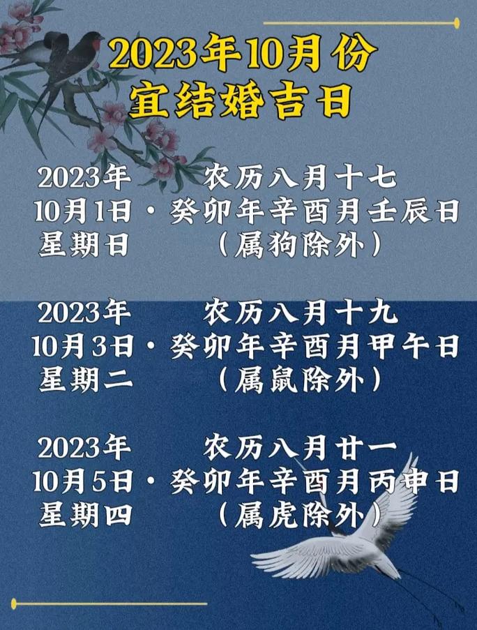 依据夏历,2023 年 10 月共有 3 个黄讲谷旦合适成婚,分辨是: