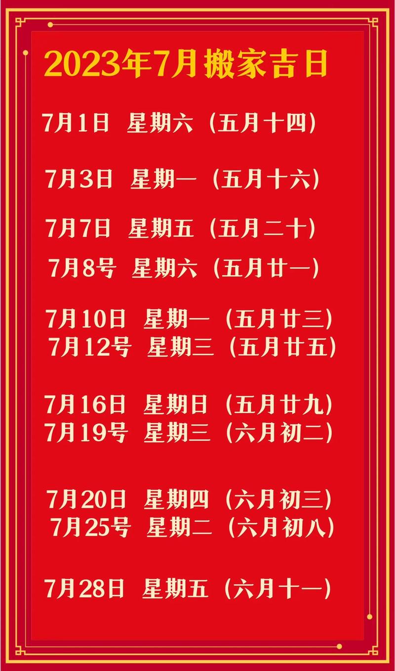 依据2024年7月的皇历战五止实际,以下几个日子是搬进家具的谷旦,合适挑选那些日子停止家具调换或搬场: