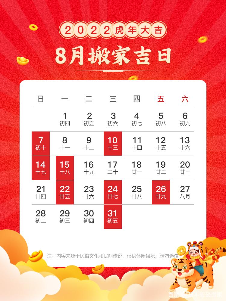 传统文明中,搬家被视为一件须要特殊重视吉祥的工作。依据风火教道,挑选适合的日子停止搬家能够为家庭带去财气、安康战幸运。八月是夏历夏日的最初一个月,气象逐步转凉,为搬场供给了温馨的情况。八月也有着丰盛的传统节日战庆典,那些身分使得八月成为挑选谷旦的要害机会。