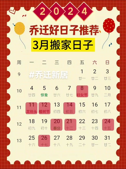 搬场是人生中的严重事务,挑选一个吉祥的日子对带去好运战繁华相当主要。2024年3月供给了几个合适搬场的有益时段,为您的新房带去吉利战繁华。