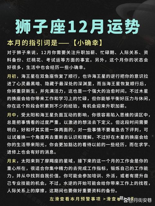 对于狮子座来说,2024年12月将是一个颠覆性的月份,仿佛命运的天平在这个寒冬时节发生了剧烈的倾斜。无论是事业、感情,还是个人成长,狮子座都将面临一系列的重大变动。这不仅是挑战的考验,更是自我突破的契机。本文将详细解析狮子座12月的运势变化,帮助你把握这个关键时刻的机遇与挑战。