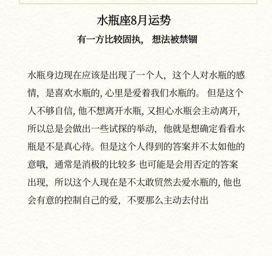 在8月的最后几周,水瓶座的你将会进行一场深入的自我探索。你可能会对自己的感情生活产生更多的自我反思,试图弄清楚自己的真实需求和感情方向。这一过程可能会带来一定的心理压力,但它也为你提供了一个重新审视和调整感情观的契机。通过对自我的深入了解,你将能够在未来的感情中更加自信和清晰。