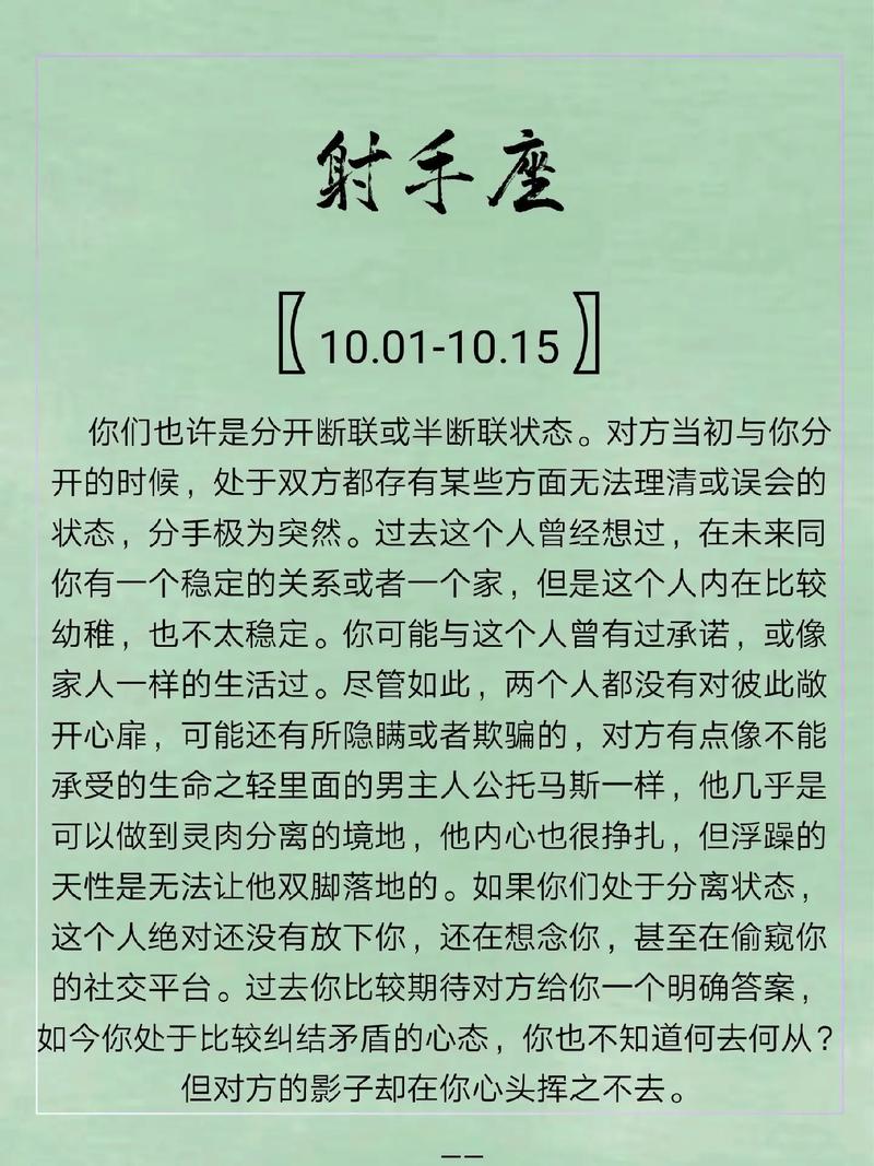 对于已有伴侣的射手座来说,10月是一个深刻检视与沟通的时期。伴侣关系中可能会出现一些长期未曾解决的矛盾,尤其是在生活理念或价值观上的分歧。这时,射手座要学会放下过于冲动和自我的态度,尝试从伴侣的角度来看待问题。虽然这一过程可能会让你感到不适,但它也是向“情感深度”的最终目标迈进的重要一步。通过坦诚的对话和理解,你与伴侣的关系将进入一个全新的层次。