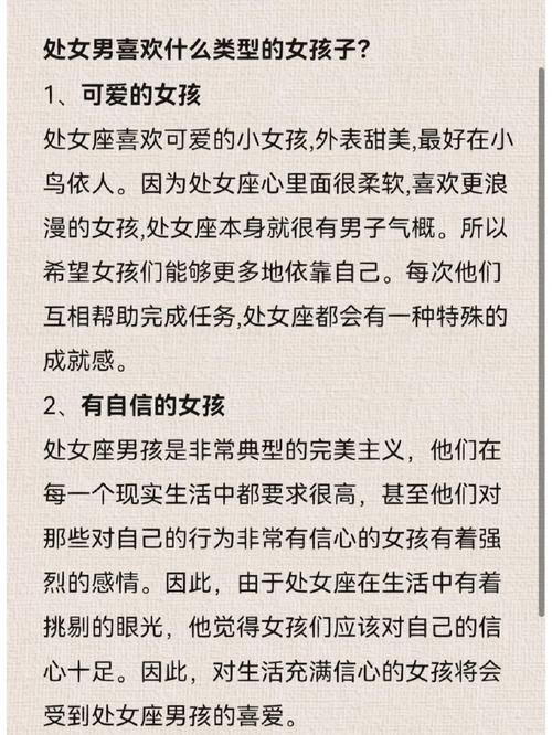 处女座男生喜欢品德高尚、心地善良的女生。他们认为,这样的女生正直诚实,值得信赖。和她们在一起,处女座男生会感到踏实和可靠。他们知道,这些女生不会欺骗他们,也不会背叛他们。