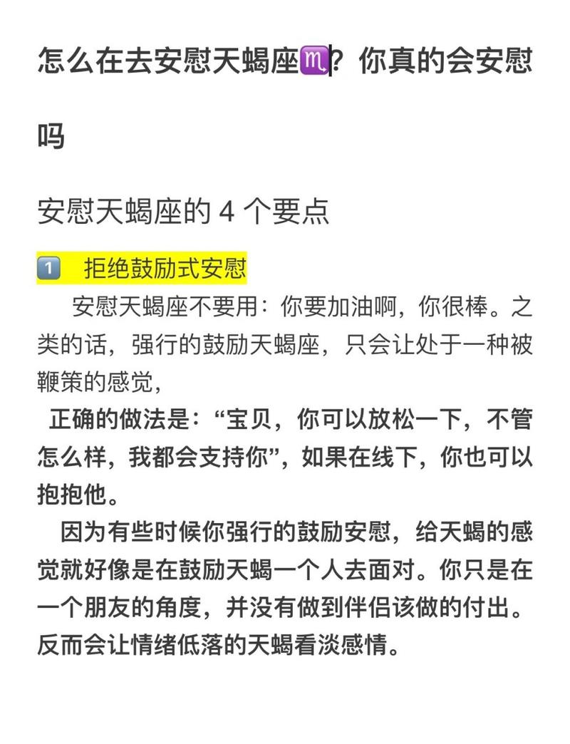 天蝎座的情感非常真挚,他们不喜欢空洞和肤浅的安慰。在面对天蝎座感情受伤的情况时,千万不要随便说一些像“没关系,时间会治愈一切”这样的空话。这种说法对他们来说反而是一种轻视,因为天蝎座看重的是深度和真诚。与其说一些没有实际意义的安慰,不如让他们感受到你是真心关心和理解他们的痛苦。你可以用行动表达关心,比如陪伴在他们身边,或是为他们提供实际的帮助,而不仅仅停留在表面的安慰。