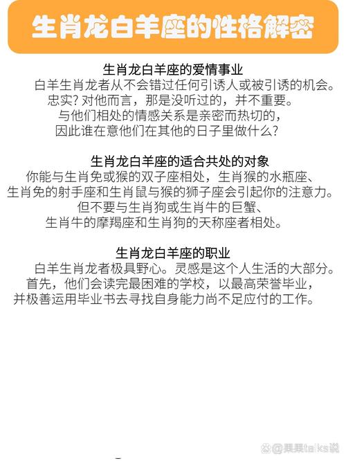 事业心强:白羊座属龙的人天性好强,渴望成功,他们往往会在事业上投入大量时间和精力。