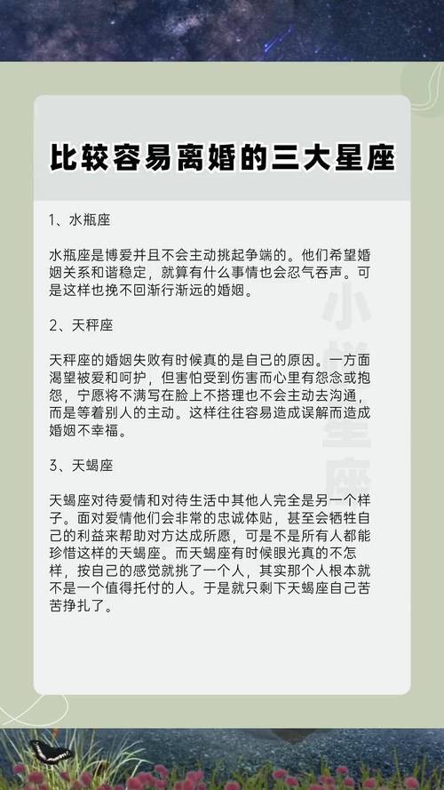 水瓶座也是一个崇尚自由和独立的星座,他们可能很难容忍婚姻中传统的角色和期望,当他们感到被压抑或控制时,可能会选择离婚,以维护自己的个性和自由。