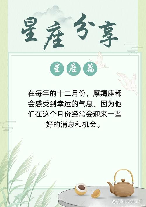 亲爱的摩羯座朋友们,记住这些幸运的日子吧,愿它们成为你前行路上的明灯,指引你走向更加灿烂的未来。如果幸运之神迟迟不肯降临,也不要灰心哦,或许它正在酝酿一场更大的惊喜,耐心等待它的到来吧!