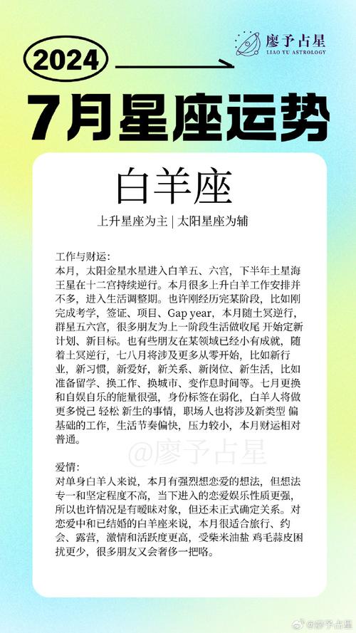 白羊座的朋友们,这周在花钱方面也要谨慎一些,避免冲动消费。虽然你们这周财运不错,但也要学会开源节流,合理规划自己的支出,以免入不敷出。