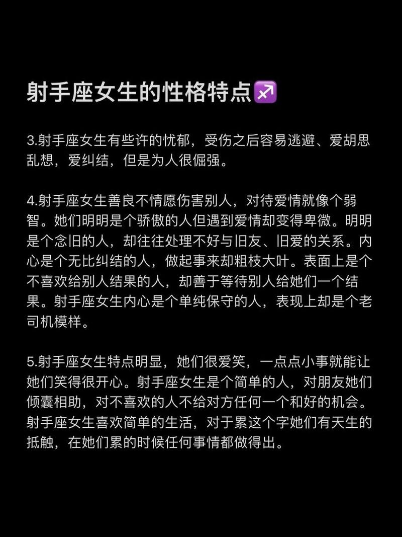 说射手女花心真的很不公平,说射手女喜欢玩感情游戏更是大错特错。说射手女分不清楚友情和爱情简直荒谬。在她们的内心正爱只有一个,一旦爱上,嘴上花了心里却处处为心爱的人着想,自律性很高,对自己的另一半,绝对的负责。同样她也会给对方同样程度的信任。所以如果你欺骗她那对她造成的伤害可想而知。看射手女有一大堆异性朋友,那都是被射手女认为只是朋友的朋友。甚至像兄弟姐妹一样的朋友。射手女对朋友很热情,反而对自己的爱人忽冷忽热,因为她怕失去主动权,别介意,就这个性格。就这么冷酷。但一定是专一的。很多跟射手女分了的后来都会后悔。对不起,一旦射手女跟你说再见了,九头牛都拉不回,很少有射手女说再见后会回头的。她会跟你说再见并不是变心爱上别人,而是你真的伤到她的心了。很多时候射手女把自尊看得很重要。也有点固执,一旦爱了,或许就一生一世了,如果你不懂得珍惜那你千万别让她爱上你。等她一头钻进去时,她爱得比谁都还认真。并且达到痴情的份上。爱过射手女的你们应该体会过吧。告诉你,只有同样勇敢和不怕死的最后才能抱得美人归喔!