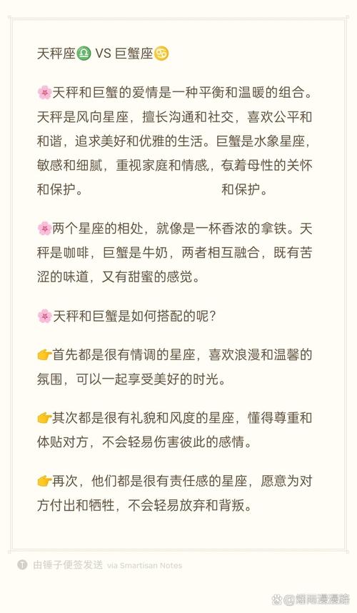 1、多问问伴侣的感受,以减少因疏忽而积下的怨尤。天秤追求自由与梦想的同时,注意平衡现实,有敏锐的优势,给多疑的巨蟹一份安稳。