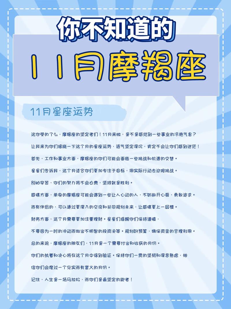 在11月的这个日子里,摩羯座的运势呈现出令人振奋的积极迹象。无论你是摩羯座的忠实拥趸,还是对星象有着浓厚兴趣的读者,今天的星象将揭示如何在这个充满机遇的月份中,抓住每一个可能的突破点。让我们深入探讨今日的运势,了解摩羯座如何在工作、感情和个人成长上迎接挑战和机遇。